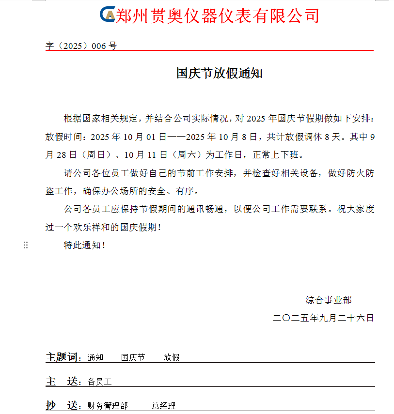 上一篇:鄭州貫奧儀器儀表有限公司2025端午節(jié)放假通知 !